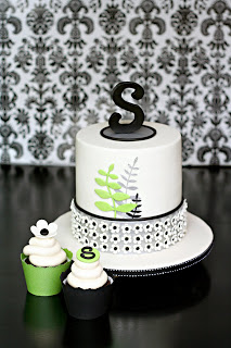 Because of the time frame involved and that they only gave me a week to finish the project, I decided to do a “cupcake tower” type wedding cake. So, I designed a smaller cutting cake with the cupcakes that would go on a cupcake tower. I didn’t have the time to make all the cupcakes or get the tower, it was the idea that mattered. The black and the silver details were hand painted and the green was fondant cut out in a modern fern design. I ended up using it for my mom’s birthday…not very “birthday-ish” but she didn’t care! It tasted yummy! This was the gluten free cake I had made in a previous post.