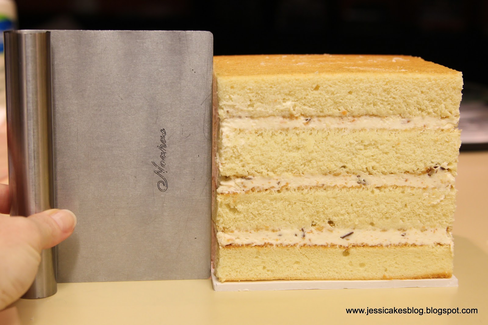 After I froze the cake a few days, I took it out of the freezer and let it rest for 10-15 min on my counter…still wrapped.  Then, I measured and cut the cake in half long ways, then in half again short ways…if that’s the way to say it!  From there I measured four equal squares (5.5″ x 5.5″) and had some left overs on the sides that can be placed together to make one layer…so you could almost have 6 layers of cake!! :)  I did all the cutting with the cake still wrapped so my ruler wouldn’t stick to it and pull off the top layer of cake since it can get a little gummy as it unfreezes.  Just make sure when you are done cutting you peel all the plastic wrap off!!