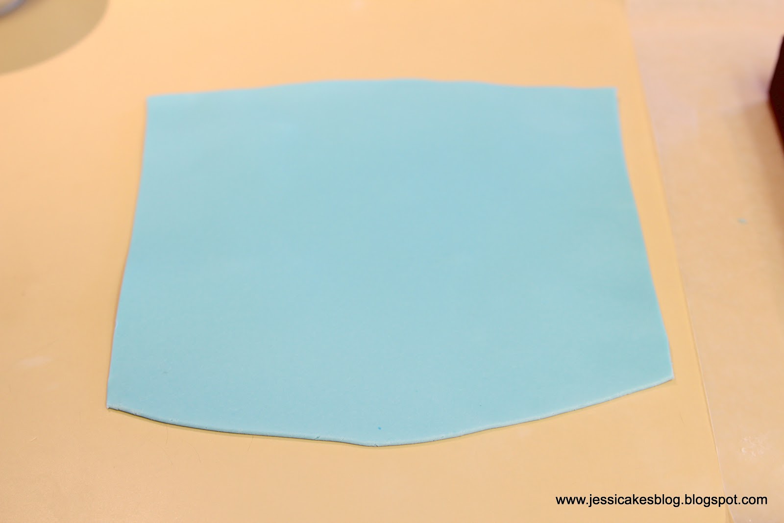 Roll the white fondant/MC blend really thin and cut into random squares about 2″x2″…but not exact.  You can see the piece I have on the counter down below is a little rounded on the sides…no worries!